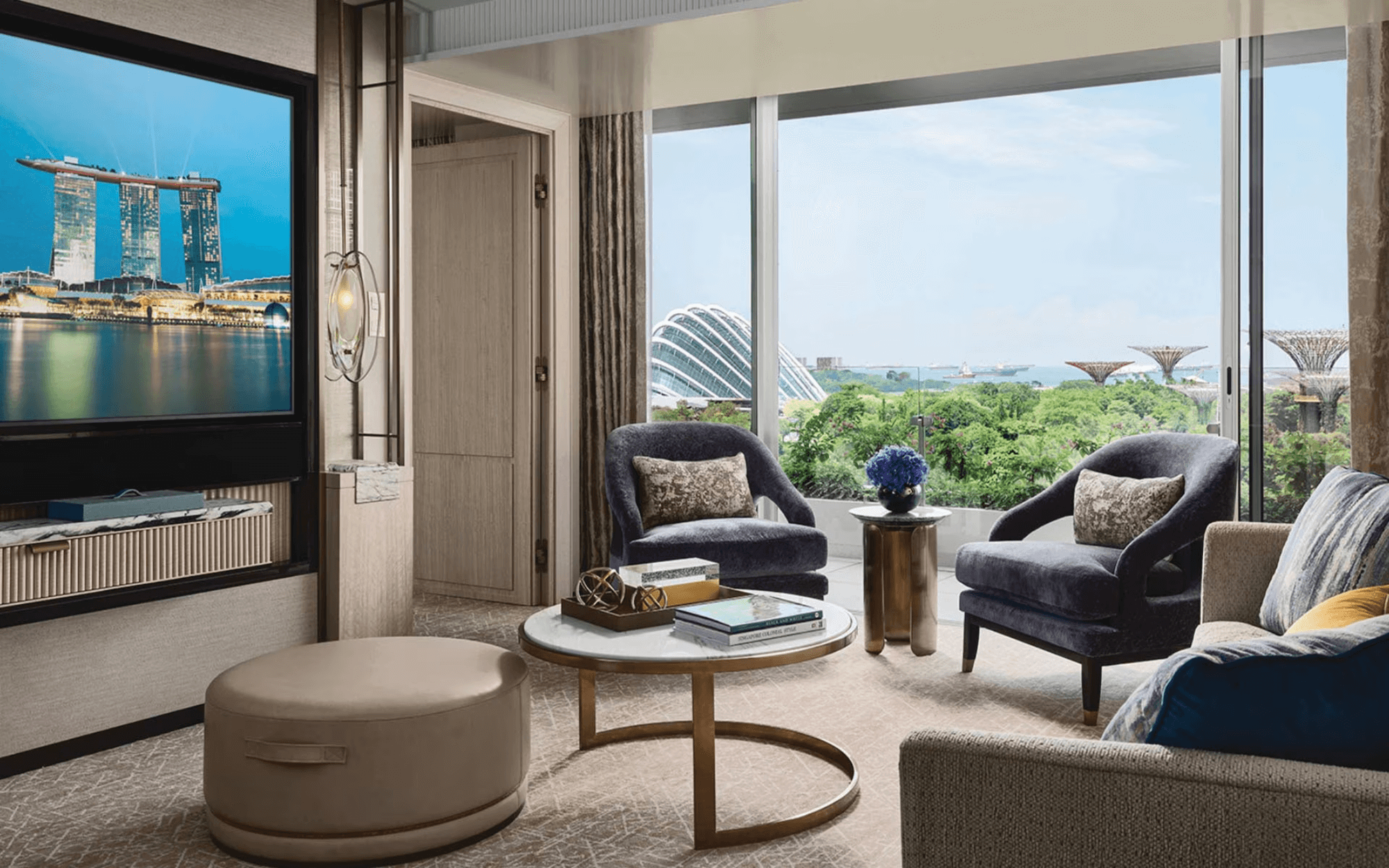 Marina Bay Sands — это культовый пятизвездочный курорт в Сингапуре, признанный одним из самых дорогих и узнаваемых архитектурных сооружений мира. Sands Premier Room в отеле Marina Bay Sands — это элегантный, недавно обновленный номер площадью 45 кв. м, рассчитанный на проживание до 3 человек. Номер сочетает в себе роскошный дизайн и современные технологии, а его гостям предоставляется эксклюзивный доступ к знаменитому пейзажному бассейну (Infinity Pool). Отель состоит из трех 55-этажных башен (высотой 191 метр), объединенных на вершине огромной платформой в форме корабля, известной как Sands SkyPark.
